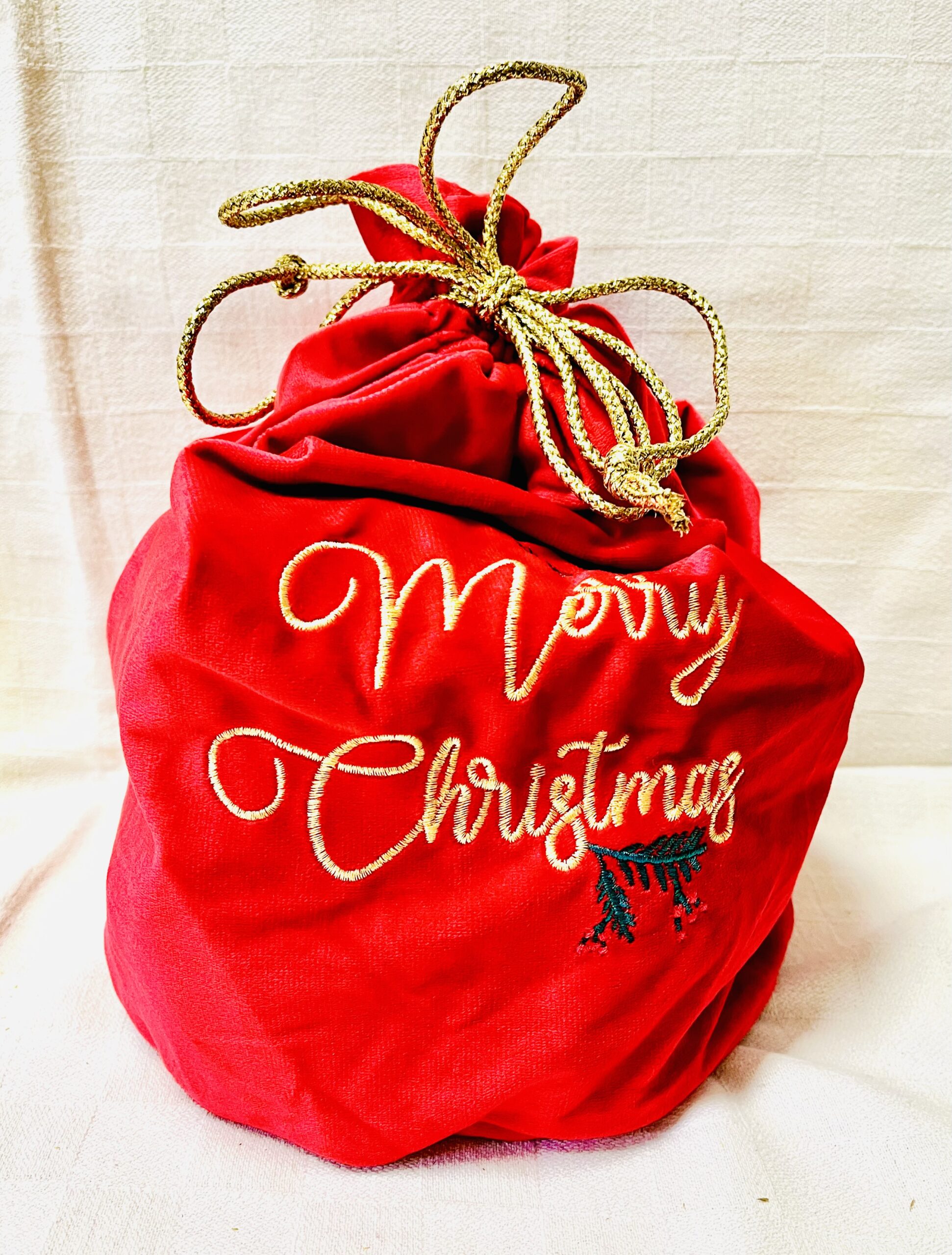 Sacco in stoffa natalizia disponibile in colori differenti, rosso, bianco, verde, contenente prodotti a vostra scelta.