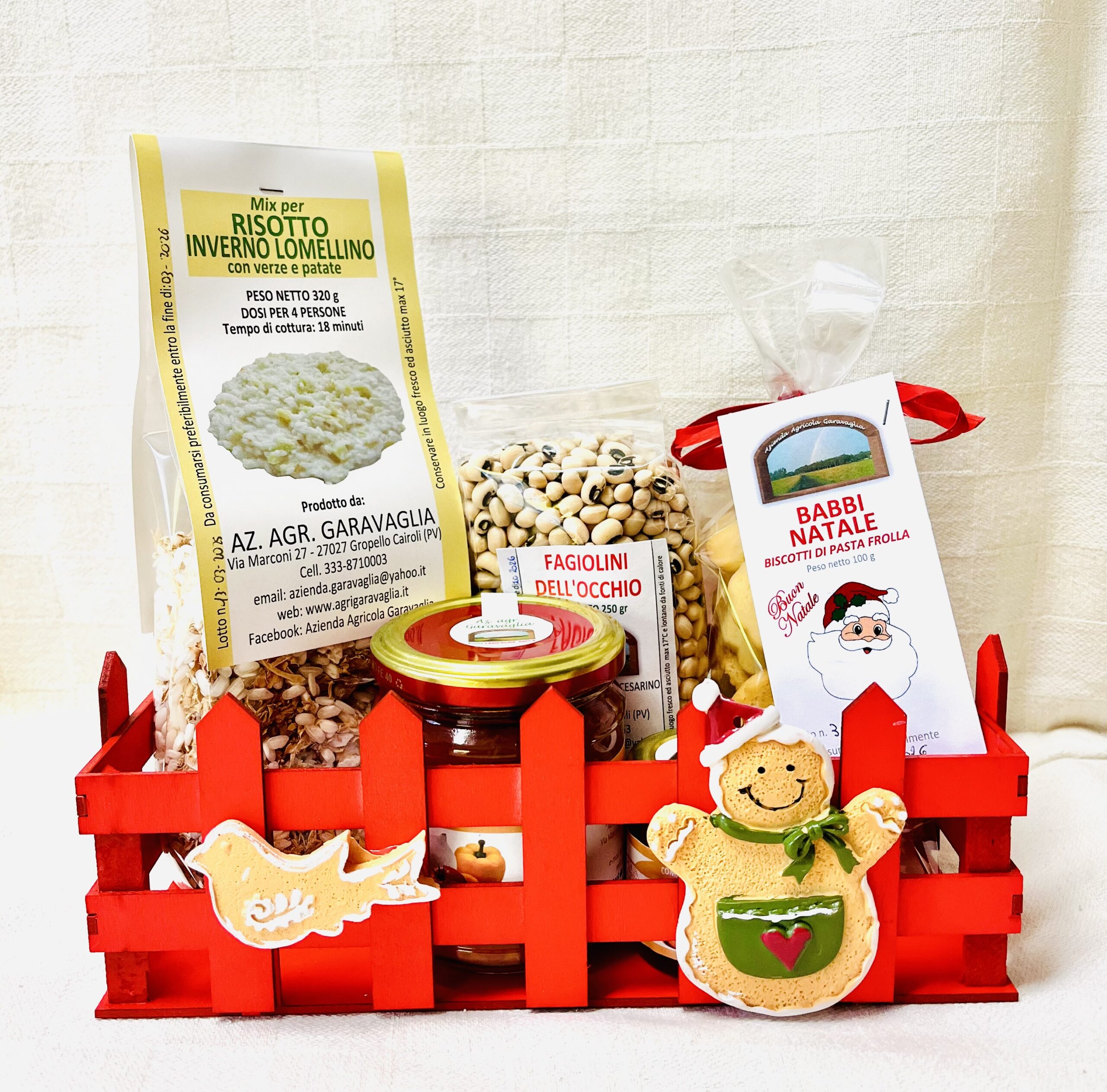 Es. in fotografia: cassetta + 1 risotto grande + 1 slsa salata 200g + 1 legume + 1 biscotto + 1 confettura 40g: 18,10€